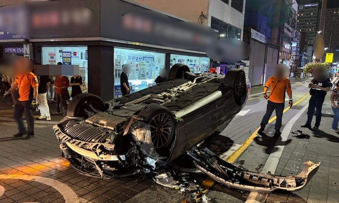 14일 경찰 등에 따르면 전날 오전 1시쯤 부산 해운대구 우동 해운대구청 어귀삼거리에서 구청 방향으로 달리던 벤츠 승용차가 가로등을 들이받고 뒤집혔다.