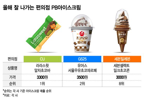 PB상품이라고 해서 가격이 싼 것도 아니다. 월드콘이 2200원, 메로나가 1500원인데 CU의 라라스윗말차초코바는 3300원이다. GS25의 유어스서울우유초코파르페 가격은 3500원, 세븐일레븐의 세븐셀렉트밀크초코콘 가격은 3000원이다.
