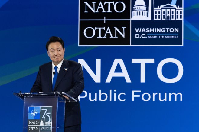 윤석열 대통령이 지난 11일(현지시간) 미국 워싱턴DC 메리어트 마르퀴스 호텔에서 열린 나토 (NATO·북대서양조약기구) 퍼블릭포럼 인도·태평양 세션에서 연설하고 있다. /공동취재단 |