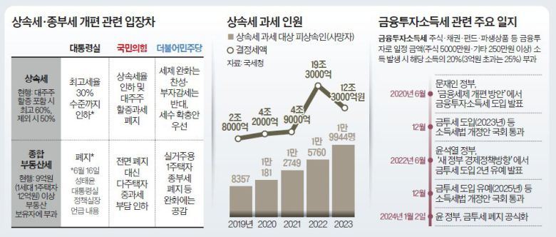 상속세·종합부동산세(종부세)는 소폭 완화하고, 금융투자소득세(금투세)와 가상자산 과세는 부과 시기를 미루고…. 내년도 세법 개정안을 미세 조정하는 ‘현실론’이 힘을 받고 있다. 강경 모드로 일관하던 야당이 최근 감세(減稅)에 다소 유화적으로 돌아서면서다.