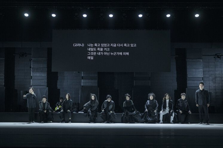 2021년 서울 국립극단 명동예술극장의 연극 ‘로드 킬 인 더 씨어터’에서 무대 뒤에 해설 자막이 나오고 있다. 국립극단 제공