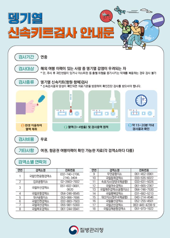 도 관계자는 "안전한 해외여행을 위해 여행 전 뎅기열 예방 수칙을 숙지하고, 의심 증상이 있으면 입국 때 검역소 뎅기열 신속키트검사를 활용해 달라"고 당부했다.