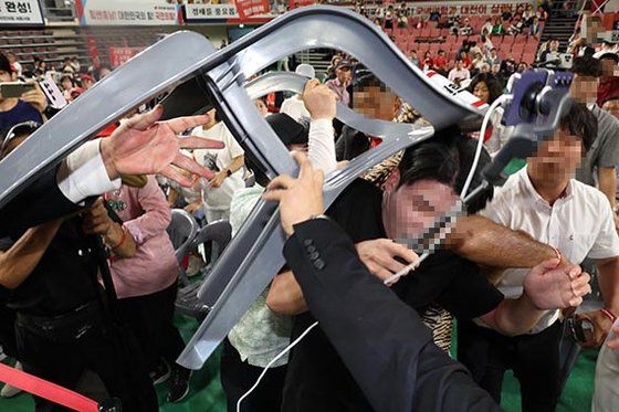 국민의힘 대전·세종·충북·충남 당원 3000여 명이 모인 합동연설회에서 일부 지지자들 사이에 물리적 충돌이 발생했다. 15일 충남 천안 유관순체육관에서 열린 7·23 전당대회 네번째 합동연설회에선 당대표 후보들의 정견 발표가 차례로 이어졌다. 나경원, 원희룡 후보에 이어 한동훈 후보가 발표를 위해 무대에 올랐다. 한 후보가 발언을 시작하자 한 참석자가 “배신자”라고 외치며 연단을 향해 의자를 집어 던지려 했고, 이를 한 후보의 지지자들이 제지하는 과정에서 거친 몸싸움이 벌어졌다.