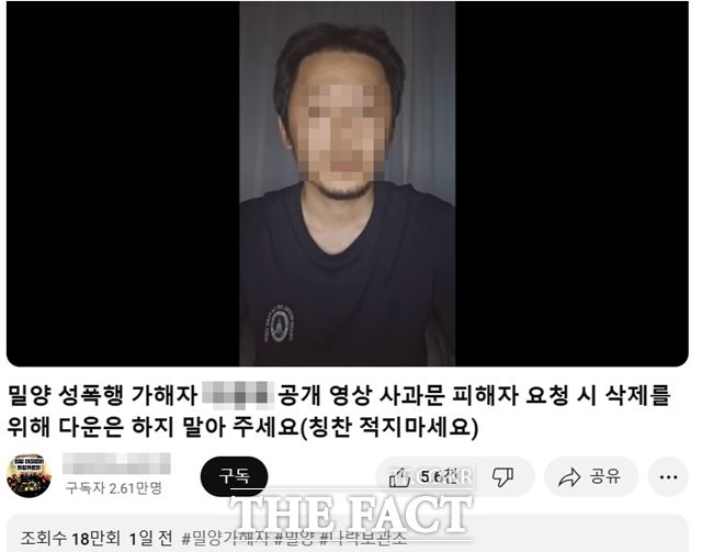 유튜브 채널 '밀양더글로리'에는 지난 14일 '밀양 성폭행 가해자 이XX 공개 영상 사과문(칭찬 적지마세요)'라는 제목의 약 3분짜리 영상이 올라왔다.