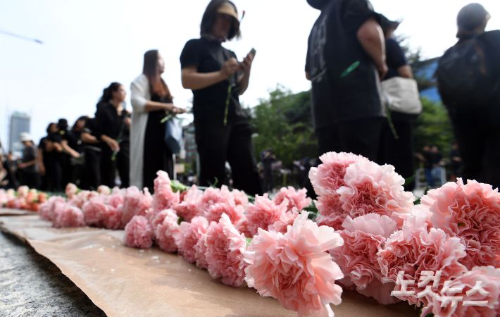 '故 서이초 교사 49재 추모집회' 에 참가한 교사들이 카네이션 헌화를 하고 있다. 황진환 기자 |