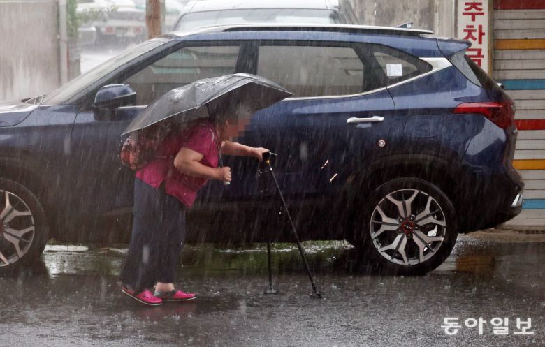 중부지방을 중심으로 수도권 일대에 호우경보가 발령된 17일 오전 경기 파주시 문산읍에서 허리가 구부정한 한 노인이 한 손에는 우산을 그리고 한 손에는 2개의 지팡이를 짚고 거센 비를 뚫고 노인복지센터로 가고 있다. 전영한 기자 scoopjyh@donga.com |