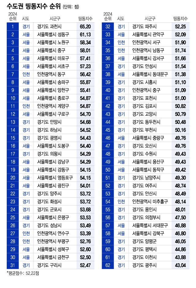 과천시 띵동지수는 65.20점으로 수도권에서 가장 높았다. 정량지표(66.57점)와 정성지표(64.96점) 모두 전체 1위를 차지했다. 상위 10위권 내에서 인천광역시 동구와 함께 유일하게 서울이 아닌 지역이다. 보육과 안전, 의료 등 수치화해 평가할 수 있는 인프라가 잘 갖춰진데다 주민들도 이에 만족하고 있다는 의미다. 실제로 과천시는 지난 2월 발표된 통계청 '2023년 인구동향조사'에서 합계출산율(가임 여성 1명이 평생 낳을 것으로 예상되는 평균 출생아 수)이 1.02명으로 경기도 내 31개 지방자치단체 가운데 가장 높은 수준을 기록했다. 과천시는 최근 저출산대응TF(태스크포스)팀도 신설해 운영 중이다.