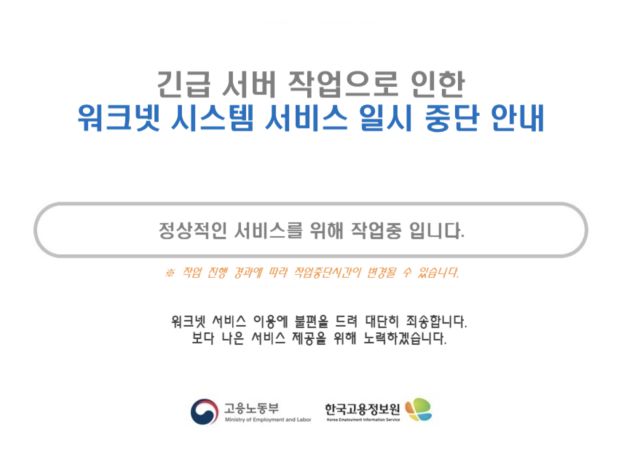 고용24, 워크넷, 고용보험 등 일부 정부 고용취업 홈페이지도 이날 오전 접속이 되지 않는 상황이 발생했다. 고용노동부와 한국고용정보원은 워크넷 공지를 통해 “긴급 서버 작업으로 인한 시스템 서비스 일시 중단”이라며 “정상적인 서비스를 위해 작업 중”이라고 설명했다.