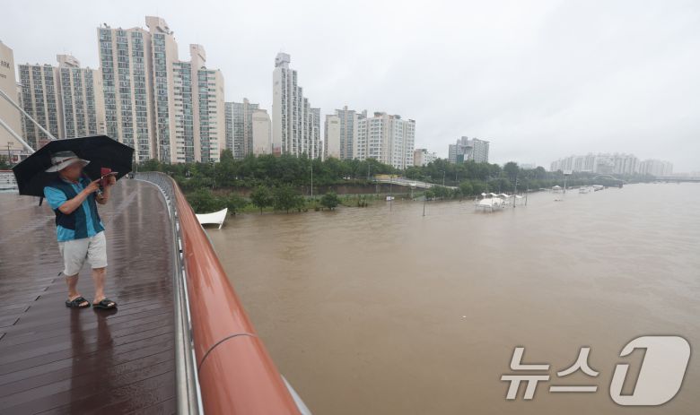 (서울=뉴스1) 신웅수 기자 = 전국적인 호우가 이어진 18일 오후 서울 중랑천 공원 산책로가 물에 잠겨 있다. 서울시는 중랑천 수위가 낮아지면서 내부순환도로 차량 통행을 이날 10시 45분부로 재개했다. 그러나 동부간선도로를 비롯해 여전히 서울 전역에서 주요 도로·하천 등이 통제되고 있는 상황이다. 2024.7.18/뉴스1