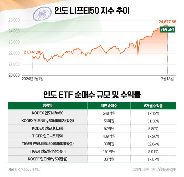 개인투자자들은 인도의 경제 성장 잠재력과 인도 증시의 시가총액이 최근 5조 달러(약 6900조원)를 넘기자 인도 관련 ETF를 통해 투자 비중을 늘리는 것으로 풀이된다.