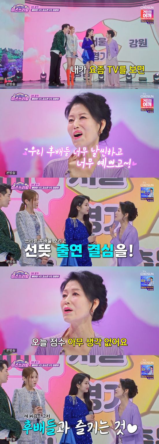 또한 정훈희는 "오늘 '미스쓰리랑'에 잘 나온 게 이렇게 노래 잘하고 멋있는 후배들과 같은 시간을 보내는 건 돈이 있어도 못 하는 일"이라고 만족스러워했다.