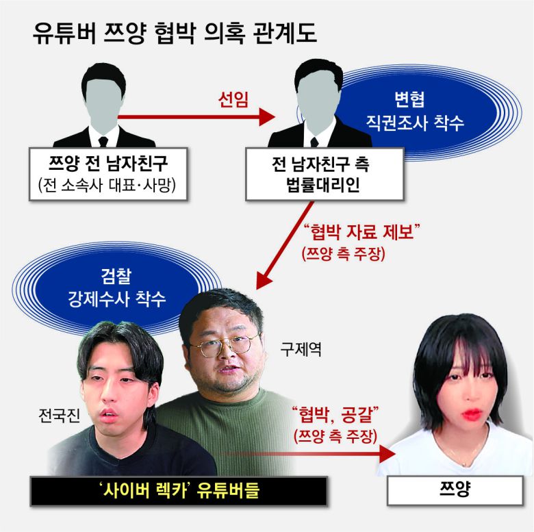 일명 ‘사이버 렉카’ 유튜버들로부터 협박을 받았다고 폭로한 ‘먹방’ 유튜버 쯔양(본명 박정원)이 유튜버 구제역(본명 이준희)에게 받은 이메일과 영상 등 관련 증거를 직접 공개했다. 특히 쯔양 측은 구제역에게 자신에 대해 ‘제보’를 한 사람이 자신의 전 남자친구이자 소속사 대표였던 A 씨(사망)가 아니라, A 씨의 법률대리인을 맡았던 변호사 B 씨라고 주장했다. 검찰은 강제수사에 착수했고, 대한변호사협회(변협)는 B 씨에 대한 직권조사에 들어갔다.