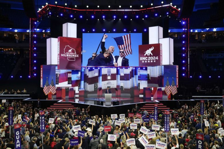17일 트럼프 지지자들이 모인 공화당 전당대회에 등장한 트럼프 피격 직후 사진 / AP 뉴시스 |