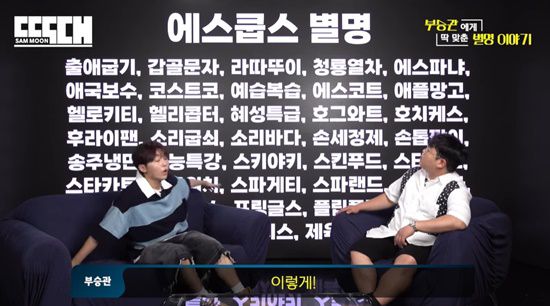 이후 화면으로 네 글자로 된 에스쿱스의 다양한 별명들이 전해졌고, 부승관은 "제가 여기 나간다고 하니까 에스쿱스 형이 자신의 이름을 꼭 기억해달라고 했다"고 강조했다.