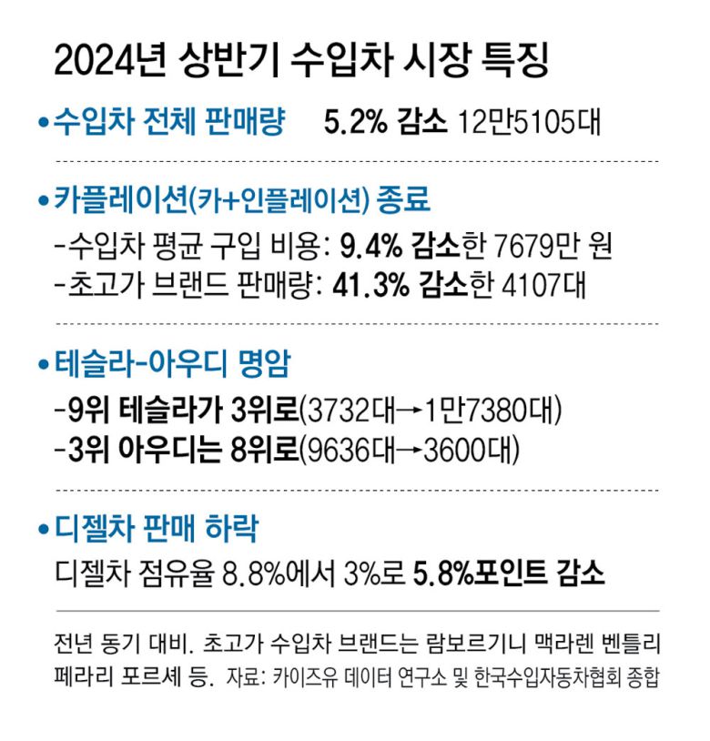 초고가 수입차 시장은 크게 위축되고 있다. 람보르기니, 맥라렌, 벤틀리, 페라리, 포르셰 등 슈퍼카·고급차 브랜드의 상반기 판매량(합계)은 전년 동기(6992대)보다 41.3% 떨어진 4107대를 나타냈다. 이 기간 8000만 원 이상 자동차 모델 중 가장 많이 팔린 5개 차량(벤츠 GLE, BMW X5, 벤츠 S클래스, BMW 6시리즈, BMW X7)의 판매량도 전년 동기보다 23.4% 줄었다. 8000만 원 이상의 고가 법인차에 연두색 번호판을 의무 부착하도록 하는 제도가 올해부터 시행된 것이 주요 배경으로 꼽힌다.
