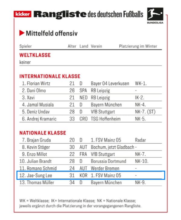 '키커'가 발표하는 랑리스테는 Weltklasse(월드클래스), Internationale Klasse(인터내셔널 클래스), 그리고 Nationale Klasse(내셔널 클래스) 부문으로 나눠진다. 이번에 발표된 후반기 랑리스테에서는 월드클래스가 없고 가장 높은 순위를 차지한 플로리안 비르츠(바이엘 레버쿠젠)가 인터내셔널 클래스의 최상단에 섰다.