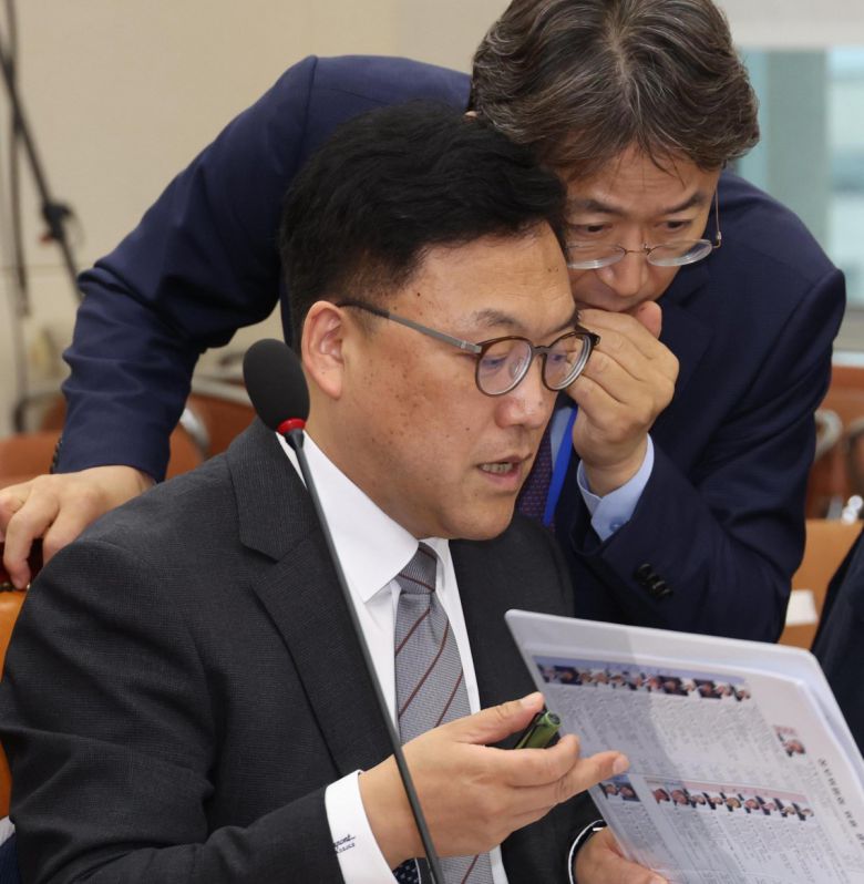 김병환 금융위원장 후보자와 김완섭 환경부 장관 후보자에 대한 인사청문회가 22일 국회 정무위원회와 환경노동위원회에서 각각 열렸다. 관련 자료를 검토하고 있는 김병환 후보자(위쪽 사진·왼쪽)에게 금융위 관계자가 귓속말을 하고 있다. 김완섭 후보자가 머리카락을 쓸어올리며 관련 자료를 응시하고 있다. 뉴시스·뉴스1