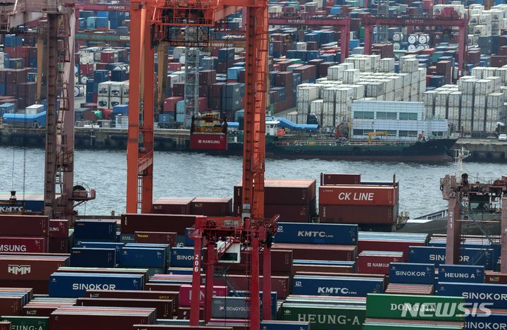 [부산=뉴시스] 하경민 기자 = 관세청에 따르면 지난 1~20일 수출은 전년 동기 대비 18.8% 증가한 371억7100만 달러, 수입은 14.2% 증가한 372억2100만 달러로 집계됐다. 또 무역수지는 5000만 달러 적자로, 연간 누적의 경우 230억 달러 흑자를 기록 중이다.22일 부산 남구 신선대부두에서 컨테이너 선적 및 하역작업이 진행되고 있다. 2024.07.22. yulnetphoto@newsis.com |