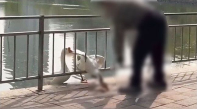 서울 광진구 건국대학교 교정에서 60대 남성 A 씨가 거위를 때리고 있다. 동물자유연대 인스타그램 캡처 |