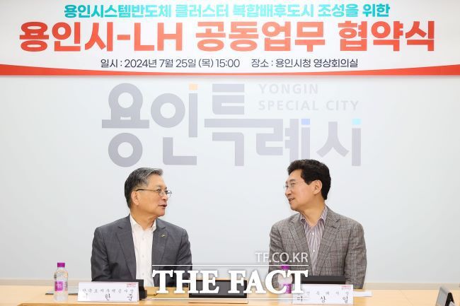 이상일(오른쪽) 용인시장이 25일 시청에서 이한준 한국토지주택공사(LH) 사장과 '용인반도체클러스터 복합배후도시 조성을 위한 공동 업무협약'을 맺으며 대화하고 있다./용인시 |