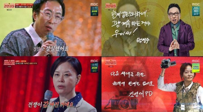 지난 26일 방송된 MBC ‘심장을 울려라 강연자들’(이하 ‘강연자들’) 3회에서는 K불교 문화 리더 금강스님, 32년 차 코미디언 박명수, 분쟁지역 전문 다큐멘터리PD 김영미가 ‘한계’를 주제로 강연을 펼쳤다. 세 강연자는 각자 자신의 삶에서 직접 경험하며 느낀 ‘한계’의 의미와 ‘절실함’에 대해 이야기했다.