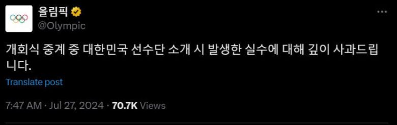IOC는 27일(한국시간) 엑스(X·옛 트위터) 한국어 서비스 계정을 통해 "개회식 중계 중 대한민국 선수단 소개 시 발생한 실수에 대해 깊이 사과드립니다"라고 밝혔다.