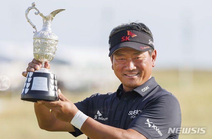 최경주가 28일(현지시각) 영국 스코틀랜드 커누스티의 커누스티 골프링크스에서 열린 미국프로골프(PGA) 투어 더 시니어 오픈 챔피언십에서 최종 합계 10언더파 278타로 생애 첫 메이저대회 우승컵을 들어 올렸다.[뉴시스 제공] |