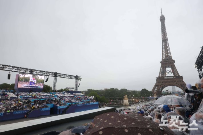 2024 파리올림픽 개막일인 26일(현지시간) 프랑스 파리 트로카데로광장에 설치된 개회식장에서 관객들이 스크린을 통해 대한민국 대표팀 선수들의 입장 모습을 보고 있다. 파리=사진공동취재단·파리=황진환 기자 |