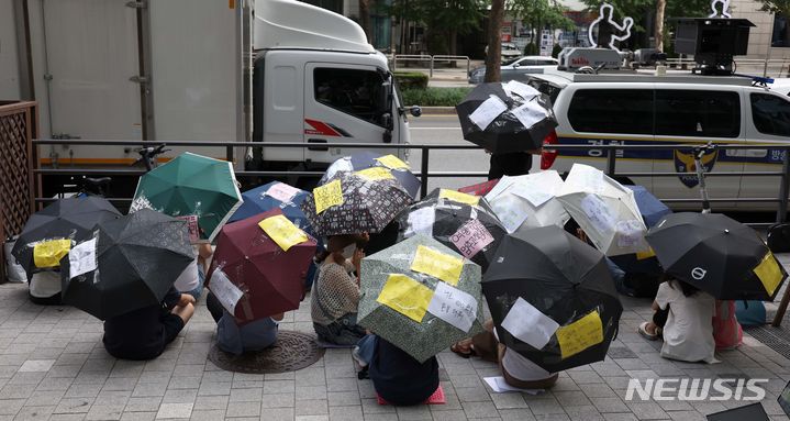 [서울=뉴시스] 김선웅 기자 = 티몬·위메프 미정산 피해자들이 28일 서울 강남구 큐텐(티몬·위메프의 모기업) 본사 앞에서 환불 및 대책 마련 등을 촉구하고 있다. 2024.07.28. mangusta@newsis.com |