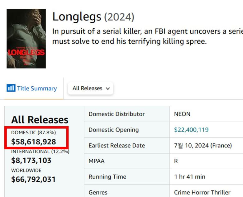 영화 '롱레그스(Longlegs)'가 북미에서 5,800만 불 이상의 수익을 기록하며 '기생충'을 제치고 배급사 네온의 역대 흥행 1위 기록을 세웠다. 이로써 '롱레그스'는 A24의 '톡 투 미'를 넘어 최근 10년 간 북미 인디 호러 영화 흥행 1위의 자리까지 차지했다.