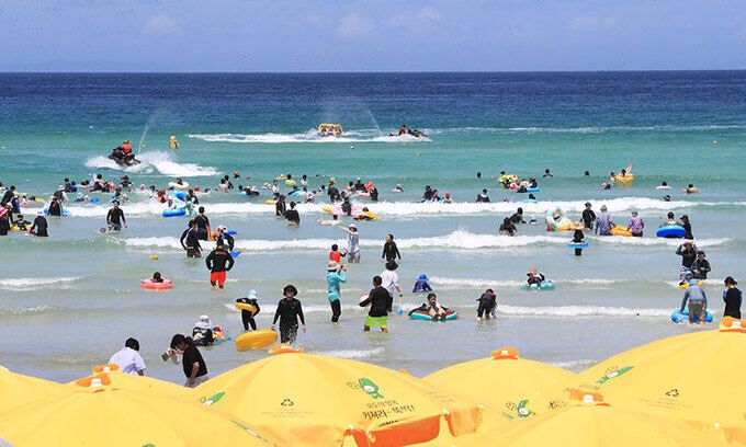 제주시 조천읍 함덕해수욕장에서 피서객들이 물놀이하고 있다. 연합뉴스 |