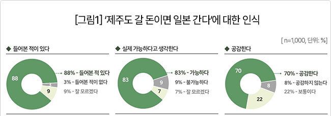 ‘제주도 갈 돈이면 일본 간다’는 말을 88%가 들어본 적 있고, 83%가 가능하다고 봤으며, 70%는 공감하고 있었다. ‘들어본 적 없다’, ‘불가능하다’, ‘공감하지 않는다’는 응답은 각각 3%, 9%, 8%에 그쳤다. 대다수가 알고 있고, 실제 가능할 것으로 믿고, 취지에 공감할 만큼 ‘제주도 갈 돈이면 일본 간다’는 말은 보편적 통념으로 자리잡았다.
