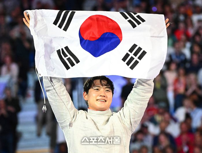 펜싱 국가대표 오상욱이 28일 프랑스 파리 그랑팔레에서 열린 2024 파리 올림픽 펜싱 남자 사브르 개인전 결승에서 튀니지의 페르야니를 꺾고 금메달을 딴 뒤 태극기를 들어보이고 있다. 파리 | 박진업 기자 upandup@sportsseoul.com |