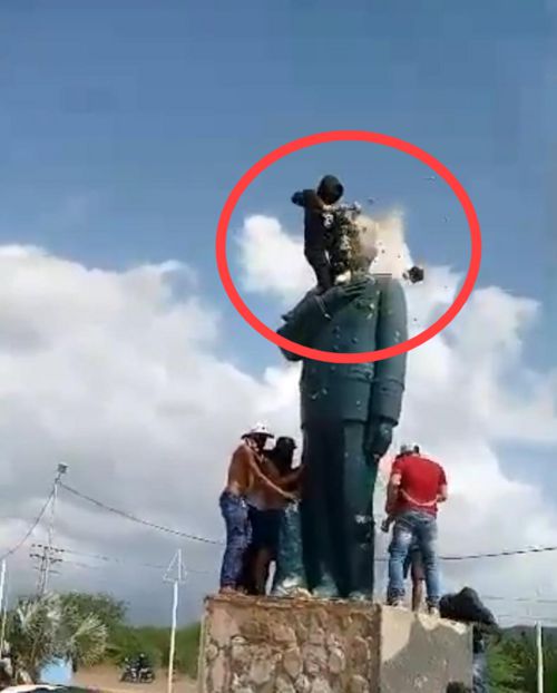 성난 베네수엘라 군중이 니콜라스 마두로 대통령의 ‘정신적 스승’인 우고 차베스 전 대통령 동상을 부수고 있다. [사진 = 엑스(X) 캡처] |