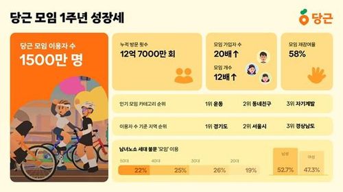 (서울=연합뉴스) 최현석 기자 = 지역 생활 커뮤니티 당근은 지역의 온오프라인 모임을 쉽고 빠르게 연결하는 '당근 모임'이 출시 1년 만에 이용자 수 1천500만 명을 넘어섰다고 31일 밝혔다. 누적 방문 횟수는 12억7천만 회에 달했다.