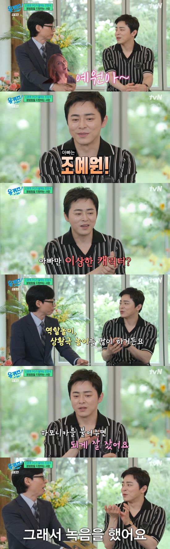 조정석은 "되게 독특하다. 역할놀이, 상황극 놀이를 많이 한다. 아빠하고 엄마하고 같이. 저만 항상 캐릭터가 이상한 쪽으로 지정을 해주더라. 예원이가 거북이일 때 엄마는 코끼리 근데 나는 해파리. 희한하다. 해파리도 있을 수 있지만 자꾸 아빠를 그런 역할을 시키니까"라며 너스레를 떨었다.