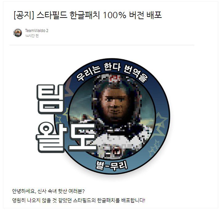 ▲ 스타필드 한국어 패치 완성 공지 (사진출처: 팀 왈도 공식 블로그) |