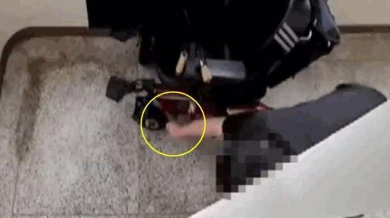 한 남성이 뾰족한 물건으로 휠체어 바퀴에 구멍을 내고 있다. [이미지출처=JTBC '사건반장'] |