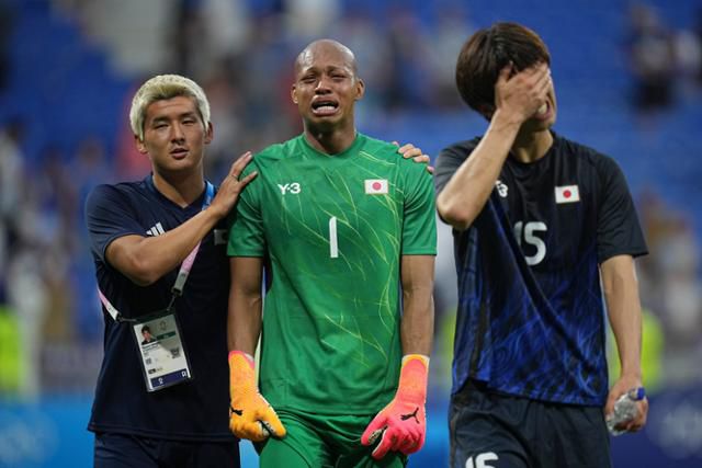 일본 남자축구 골키퍼 고쿠보 레오(가운데)와 타카이 코타(오른쪽)가 2일(현지시간) 프랑스 리옹의 스타드 드 리옹에서 열린 2024 파리 올림픽 남자축구 8강전에서 스페인에 0-3으로 대패한 후 눈물을 흘리고 있다. 파리=AP |