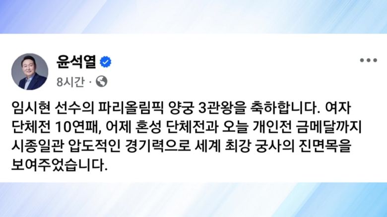 윤 대통령은 SNS를 통해 임 선수가 여자 단체전 10연패와 혼성 단체전, 개인전 금메달까지 시종일관 압도적인 경기력으로 세계 최강 궁사의 진면목을 보여줬다고 밝혔습니다.
