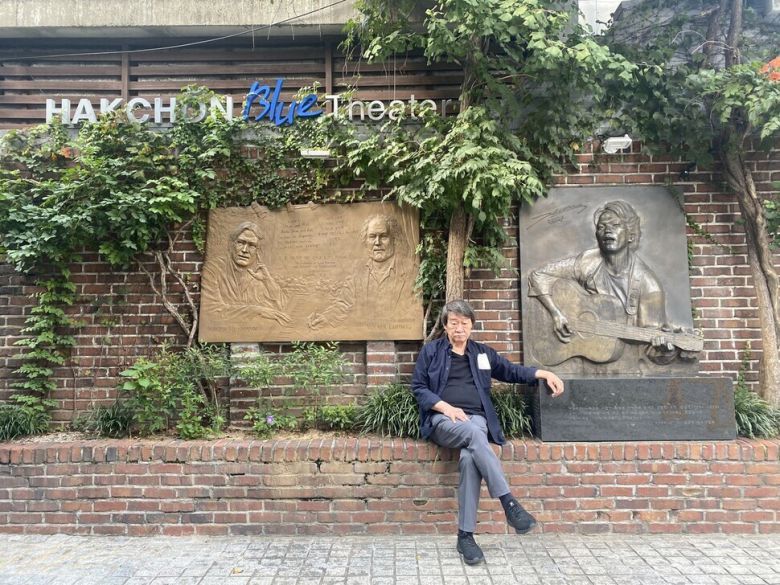 2013년 김민기 학전 대표의 생전 모습. 뒤로 김광석 노래비가 보인다. 학전 제공
