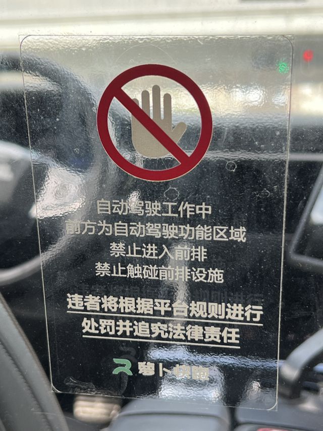 차량 곳곳에도 탑승 시 주의할 점을 스티커로 붙여놨다. 핸들에는 ‘만지지 마시오’라는 경고의 글이, 조수석에는 ‘뒷 좌석이 더 편하니 뒷 좌석에 앉아주세요’라며 완곡한 표현이 적혀 있다. 앞좌석과 뒷좌석 사이에 놓인 투명 플라스틱 가림막에는 ‘자율주행 중에 앞좌석에 들어가는 것은 금지하고, 앞좌석 설비에 손대지 말 것’이라며 ‘위반하면 플랫폼 규칙에 따라 처벌하고 법적 책임을 묻겠다’는 경고 문구가 붙었다.