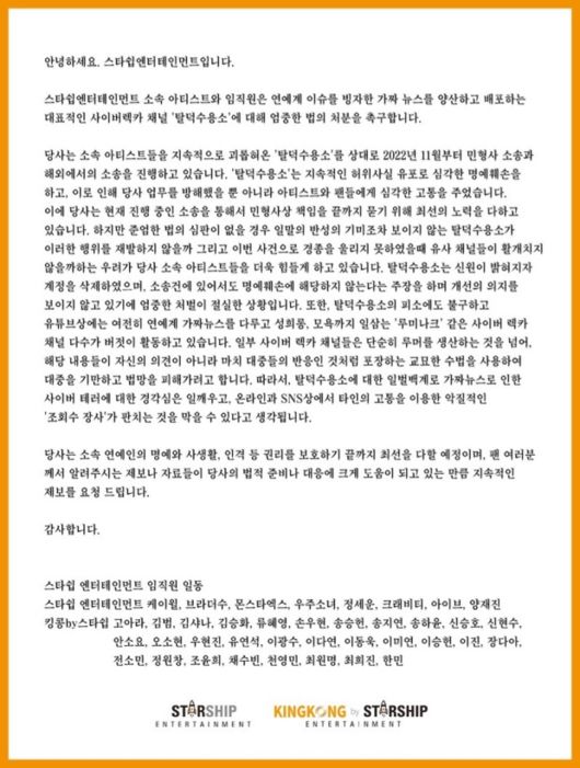 이 가운데 지난해 아이브 장원영은 자신을 비롯한 연예인들의 가짜 뉴스를 상습적으로 유포해온 '탈덕수용소'를 상대로 소송을 진행했다. 소속사 스타쉽은 지속적인 노력으로 '탈덕수용소'의 신원을 파악했고, 민형사 소송과 해외에서의 소송을 진행중인 사실을 알렸다. 이와 동시에 '탈덕수용소'를 비롯한 사이버 렉카에 대한 엄중 처벌을 촉구하는 성명서를 제기하며 렉카 유튜브의 심각성에 경종을 울렸다.