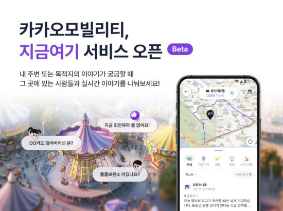 카카오모빌리티는 카카오 T 애플리케이션에서 지역 및 장소 기반의 실시간 커뮤니티 서비스인 '지금여기'를 선보인다고 7일 밝혔다. 일부 지역에서 오픈 베타를 시작하고, 사용자 이용성을 점검 후 정식 서비스로 오픈한다는 계획이다.