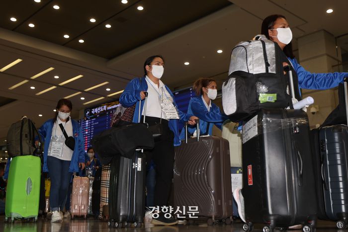 외국인 가사관리사 시범사업에 참여하는 필리핀 가사관리사들이 지난 6일 아침 인천국제공항 제1터미널을 통해 입국한 뒤 버스로 이동하고 있다. 공항사진기자단 |