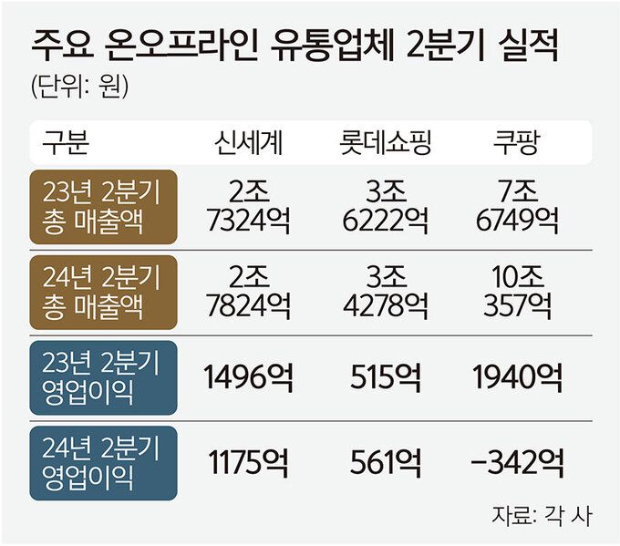 경기침체와 소비 위축 장기화로 직격탄을 맞았던 국내 주요 온·오프라인 유통업체들이 올 2분기 분기 기준 역대 최대치를 경신하는 등 호전된 실적을 거뒀다. 2분기는 1분기(설)·3분기(추석)·4분기(연말)와 비교해 ‘쇼핑 비수기’로 꼽히는 데다 ‘가정의 달’ 프로모션이 예전만큼 효과를 발휘하지 못하는 환경을 감안하면 상당한 외형 성장을 이뤘다는 평가다. 다만 투자 확대와 규제 변수 등으로 영업이익은 크게 줄어 폭발적 성장세가 내실로 이어지지는 못했다.