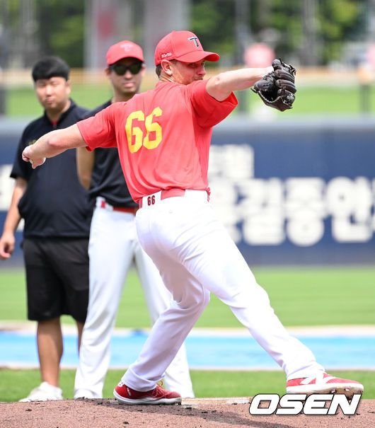 경기에 앞서 KIA 새 외국인 투수 에릭 라우어가 불펜 피칭을 하고 있다. 2024.08.08 /sunday@osen.co.kr