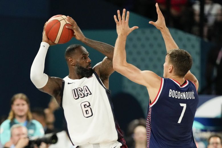 ‘드림팀’ 미국 농구 대표팀의 르브론 제임스(왼쪽)가 8일 프랑스 파리 베르시 경기장에서 열린 2024 파리올림픽 농구 남자 준결승전에서 세르비아의 보그단 보그다노비치의 수비에 맞서 공격을 펼치고 있다. 파리=AP 뉴시스 |