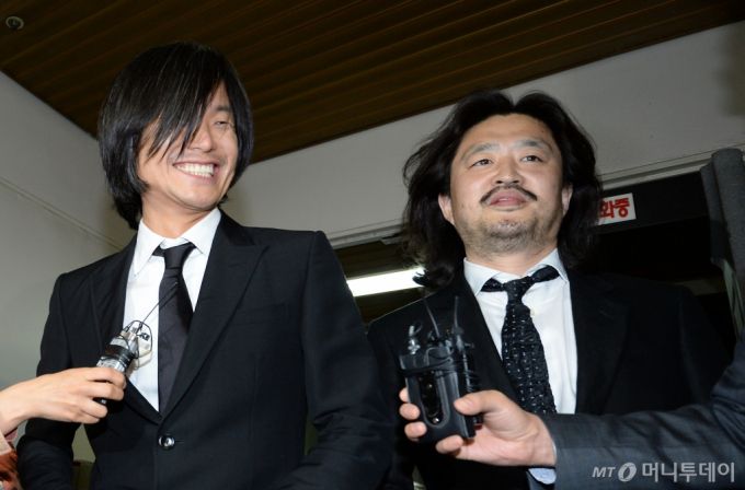 주진우 전 시사인 기자(왼쪽)와 방송인 김어준씨가 2013년 10월24일 서울중앙지법에서 열린 공직선거법 위반 명예 훼손 혐의에 대한 국민참여재판에서 무죄를 선고 받고 법원을 나서고 있다. /사진=뉴스1