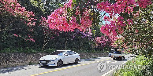 (태안=연합뉴스) 9일 충남 태안군 원북면 학암포해수욕장으로 가는 도로 양쪽에 배롱나무꽃이 활짝 피어 있다. 2024.8.9 [독자 가우현 씨 제공. 재판매 및 DB 금지]